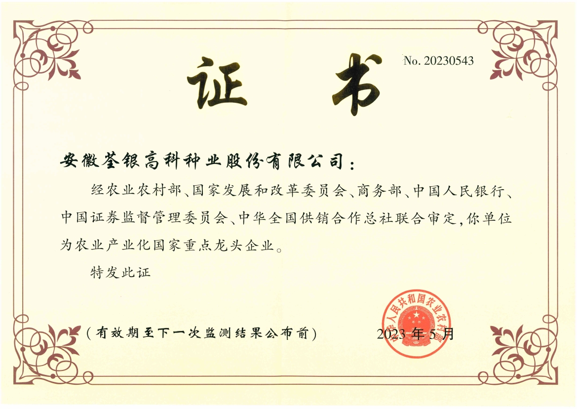 安徽荃銀高科種業(yè)股份有限公司是一家“以種業(yè)為核心、農(nóng)業(yè)服務(wù)為延伸、探索和創(chuàng)新農(nóng)業(yè)多元化發(fā)展”的現(xiàn)代高科技種業(yè)上市公司,證券代碼:300087。公司注冊(cè)資金9.47億元,系“中國種業(yè)領(lǐng)軍企業(yè)、農(nóng)業(yè)產(chǎn)業(yè)化國家重點(diǎn)龍頭企業(yè)、國家高新技術(shù)企業(yè)、農(nóng)業(yè)部首批農(nóng)作物種子育繁推一體化企業(yè)、中國種業(yè)信用明星企業(yè)"。在國內(nèi)控股子公司20多家,在國外設(shè)立分支機(jī)構(gòu)4家,良種銷售至全國20多個(gè)省(市、區(qū)),出口覆蓋20多個(gè)國家與地區(qū),種業(yè)綜合實(shí)力、雜交水稻研發(fā)、推廣及海外業(yè)務(wù)規(guī)模均居全國種子企業(yè)前2位。